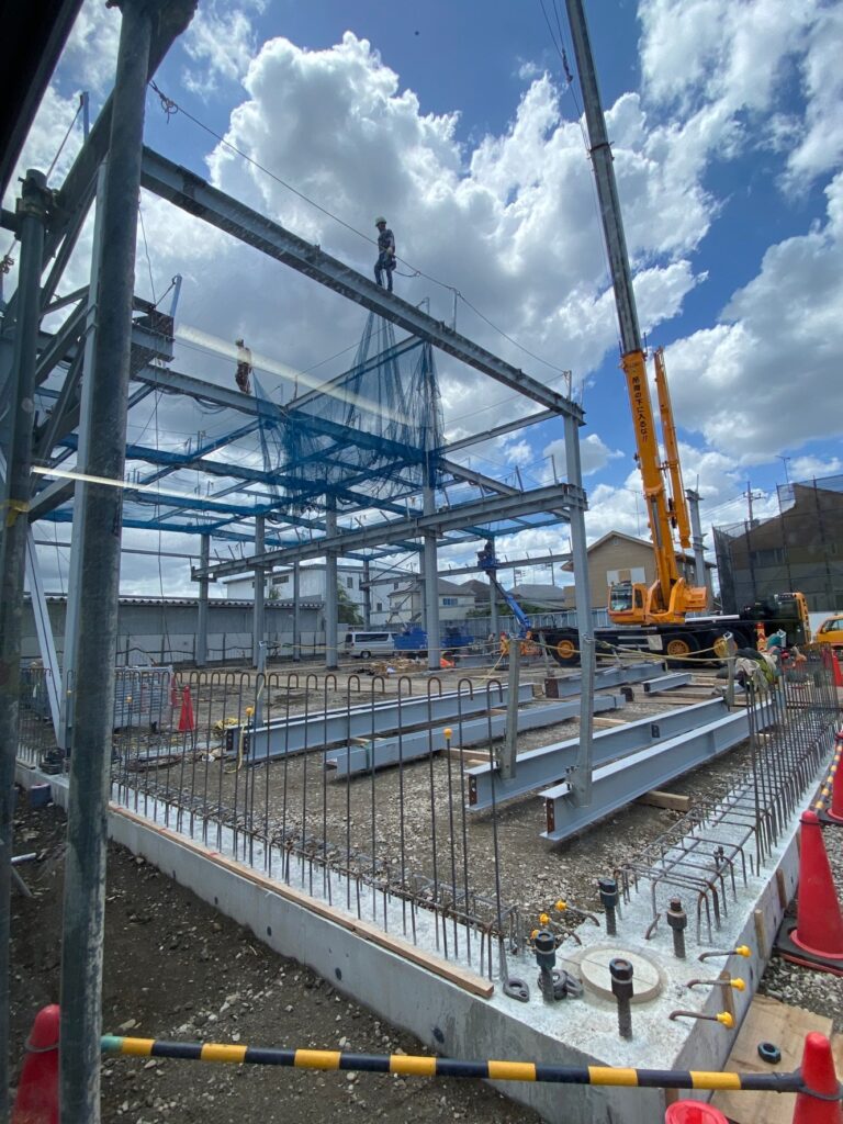 職長からのコメント: 建てる場所が狭く、荷降ろしスペースも少ない中建て方をしました。暑い時期に建て方なので鉄骨が日に焼けて熱くヤケ...